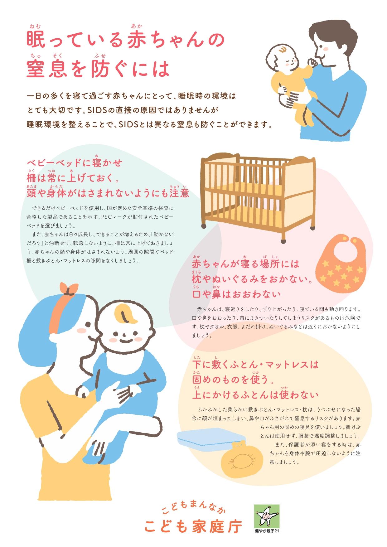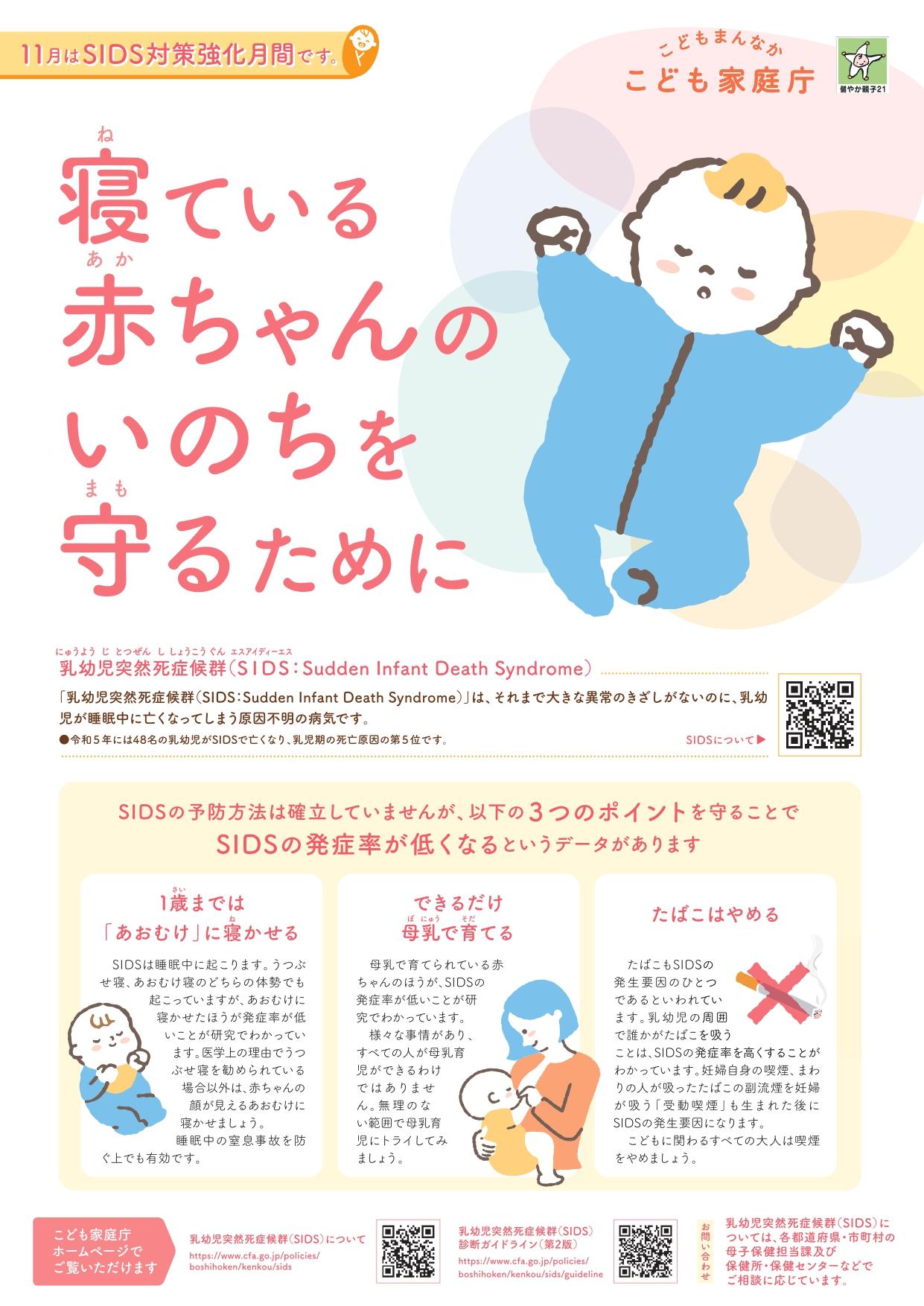 乳幼児突然死症候群(SIDS)は、それまで元気だった赤ちゃんが、睡眠中に突然亡くなってしまう原因不明の病気です。